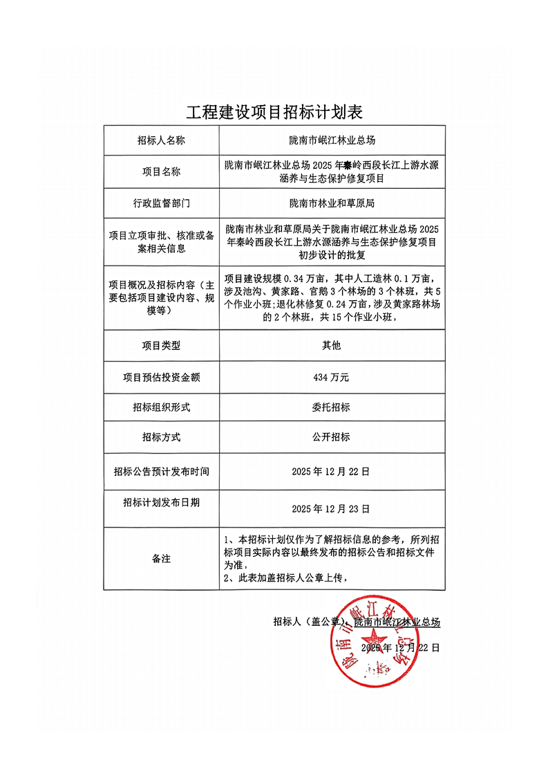隴南市岷江林業(yè)總場(chǎng)2025年秦嶺西段長(zhǎng)江上游水源涵養(yǎng)與生態(tài)保護(hù)修復(fù)項(xiàng)目