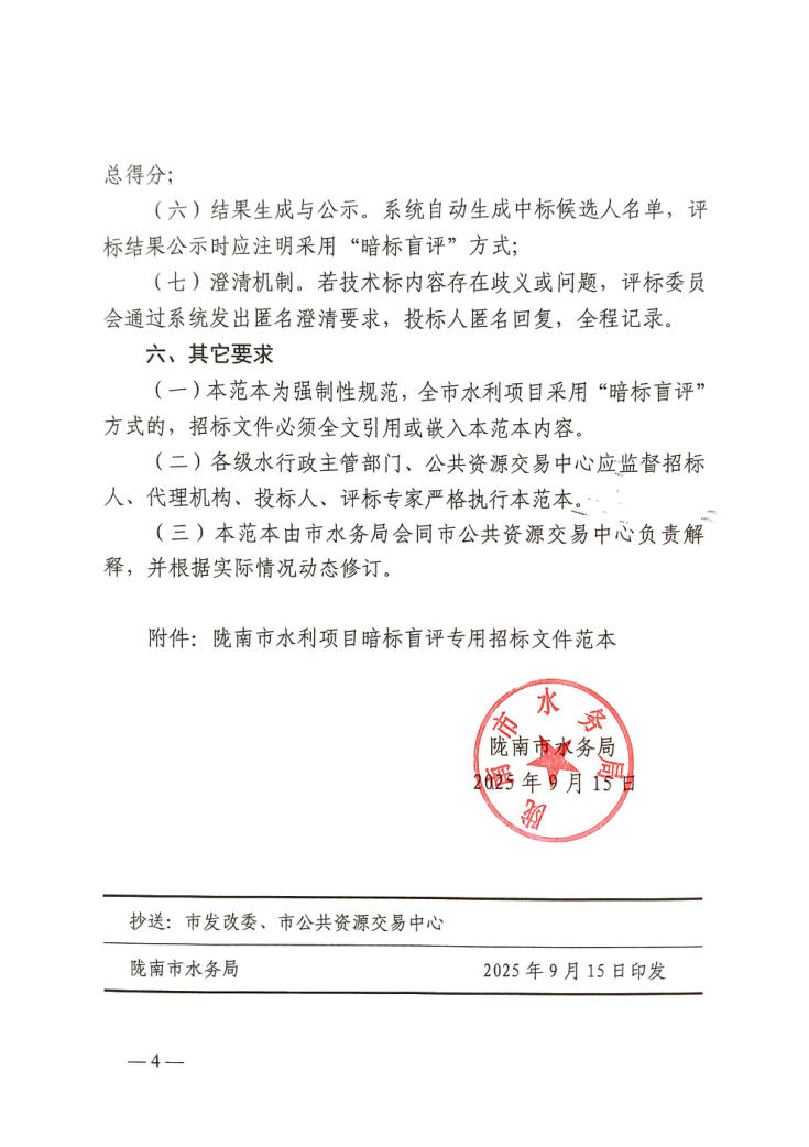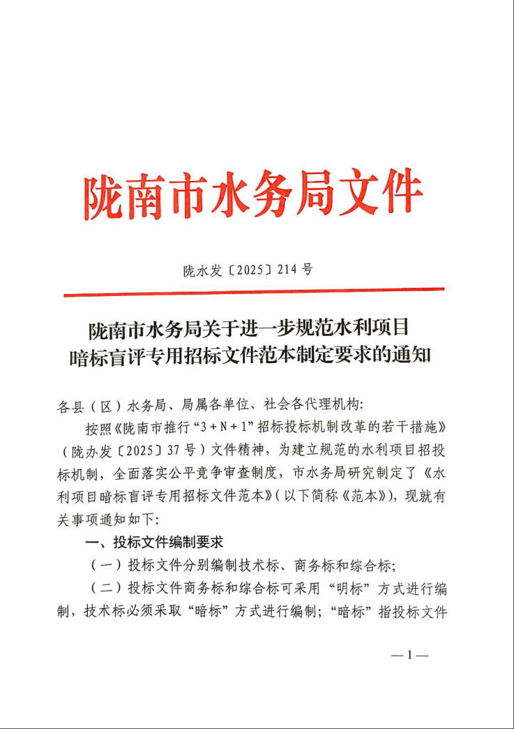 隴南市水務局關于進一步規(guī)范水利項目暗標盲評專用招標文件范本制定要求的通知